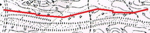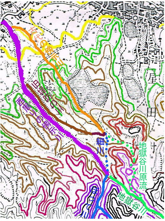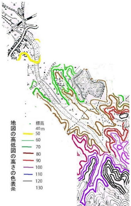 乱れた等高線の形から見た人工掘削河川である傍示川