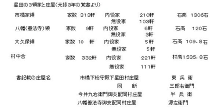 江戸時代元禄期の星田村の領主としては元禄3年の星田の3領家と庄屋の覚え書きにより市橋藩が1306石、八幡藩が120石、大久保藩が109.8石としていて、元禄10年星田村絵図では八幡藩の領地を2個所、大久保藩の領地を1個所で示している。