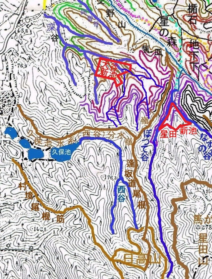 星田山(頂上は馬が峯。)の西側の山は、日高山といい、日高山から逢坂道という尾根道が逢坂や清滝峠に通じていたが、逢坂道の西側は地図で描かれているように西谷がY字形に流れていてその麓側に合峯嶺から打上村にかけて麓との間の分水嶺となる尾根筋が走っているため、山中の雨水は西谷を通じて久保池に流入し、4つの谷を通じて西隣村の打上川に流れている。