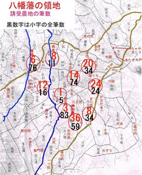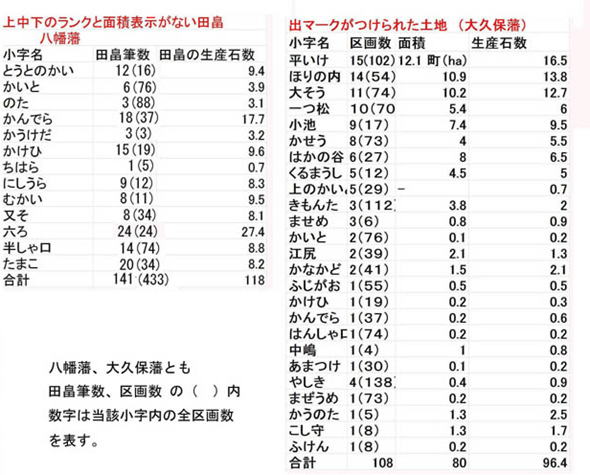 しかし各請受農家の記載の書式が別表1に掲げるように、市橋藩と大久保藩は、太閤検知の書式を使っているが大久保藩については出マークが付記されており、八幡藩については書式が全く異なっており、田畠の上中下ランクと耕地面積の記載がなく、生産石高だけの記載になっていて、当時水田耕作bとともに綿花栽培も盛んであったのでこれに対応した書式が採用されたのでないかと思われる。
