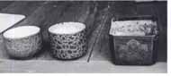 宿陣のとき家康から拝領を受けたとされる火入れ、湯呑(左)と絵皿