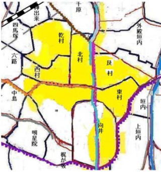 地名は、西村、乾(いぬい)村、と北,(うしとら)東、(ひつじさる)の各村で方位の名前がついていた。南村だけなかったが、南村にあたるところは、星田神社や星田寺、新宮山八幡宮などで居住地域でなかったので向井といった。