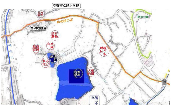 星田大池は、星田新池や大谷新池が明治後期から大正の初期に作られたのに対してこの池は古く寛永14年(1637年)に改修されたことが村の記録に残っていて。それよりも古い。星田の語源は、干し田であり、利水が困難なため平安時代には牧場に使われていたとされるが、この池によって穀倉地帯づくりに役立ったであろう。池の大きさはもともと6haあったが、3中校舎建設のため3.9haになったが、それでも交野では1番大きな池である。