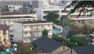 高岡山から見下ろした布懸遺跡。右の建物は3中。