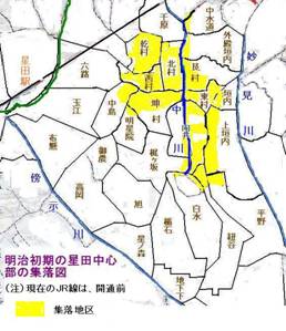 星田では、村落の中央を流れる中川の東側の東の村と中川の西側の西の村では異なった発展をとげてきた。