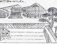 名所記が描く宿営地平井家の庭。記念石碑と家康宿営の書院の間を模した石棚が描かれている。